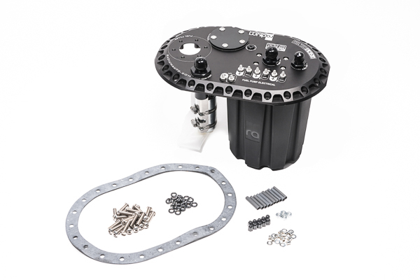 Fuel cell surge tank for use inside competition fuel cells. Outfitted for use with Walbro GSS342 style fuel pumps. Lift pump and dual feed pumps included.